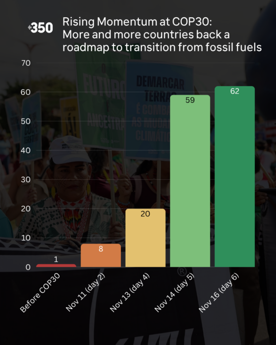 17th November, 2025 – Belém, Brazil — As COP30 enters its second week, global support for establishing a Transition Away from Fossil Fuels (TAFF) Roadmap is accelerating at remarkable speed. A new analysis from 350.org and partners shows how what began as a single call for action has rapidly grown into a powerful push to anchor a fossil fuel phase-out at the heart of the emerging Mutirão Pact”. Last night (16 Nov), the long-anticipated consultation text from the COP30 Presidency was issued, highlighting the major sticking points at COP30 – closing the ambition gap created by below-par country climate pledges (NDCs) and securing climate finance.